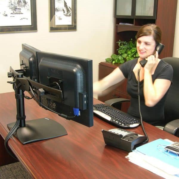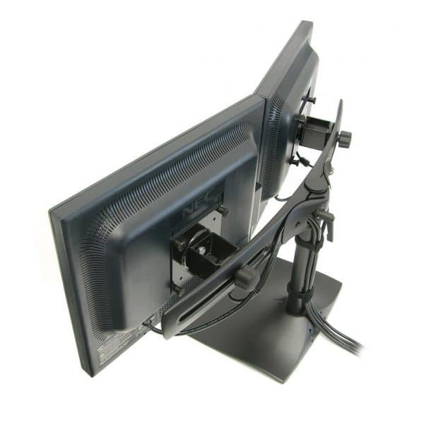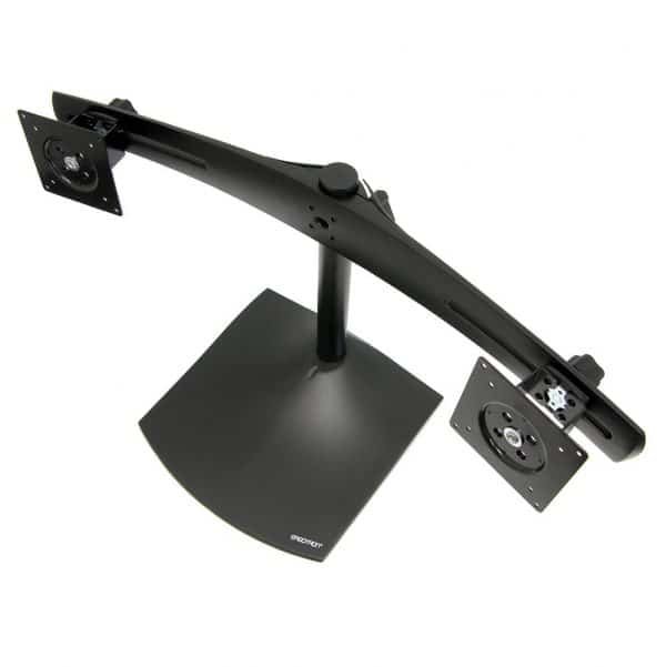 Take back your workspace. This heavy-duty desk stand suspends two monitors on a single base to uncover more work area. View screens side by side for a productivity boost. The modular construction of the DS100 monitor stand makes it easy to customize with accessory add-ons. Easily attaches to monitors that are VESA® compliant.