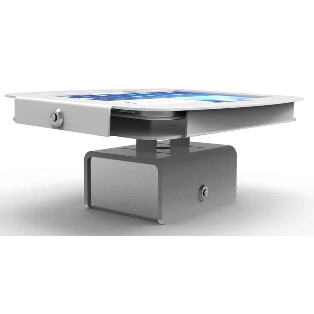 Specially designed for personal and professional display settings while maintaining the security aspect of the iPad, this flip iPad enclosure kiosk features flipping movement allowing display screen to be easily shared by opposing sides of the table. Coupled with a low profile, security cubed base, not only does this iPad enclosure facilitate display convenience, it also provides efficient cable management fitting to most universal power cable cut outs.