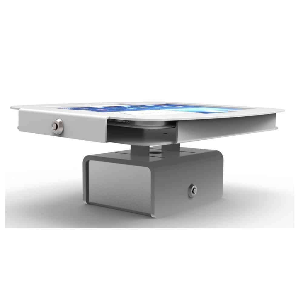 Specially designed for personal and professional display settings while maintaining the security aspect of the Samsung Galaxy, this flip Galaxy tablet enclosure kiosk features a flipping movement which allows the display screen to be easily shared by opposing sides of the table. This, coupled with a low profile, security cubed base, not only facilitates display convenience but also provides efficient cable management that fits most universal power cable cut-outs.