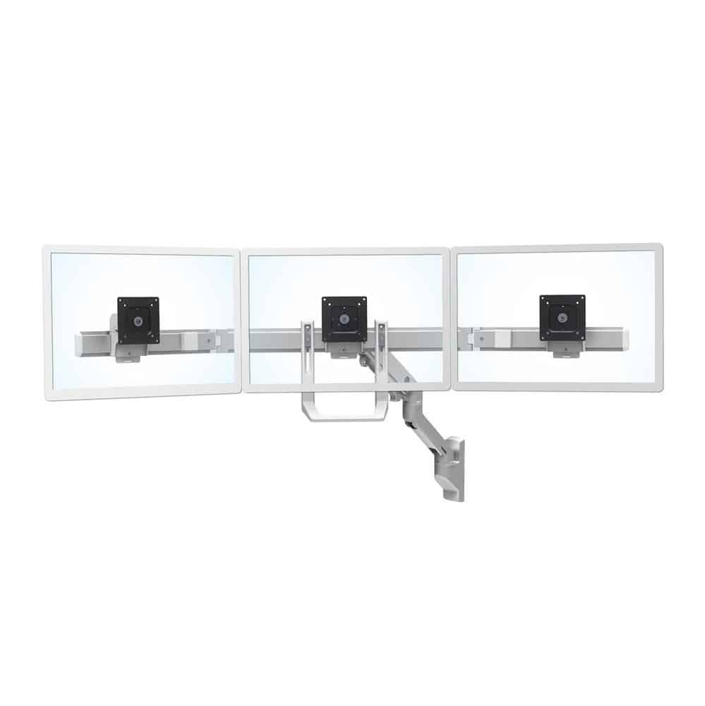 Includes arm, extension, hinge bow, 2 monitor pivots, handle, wall mount and monitor mounting hardware