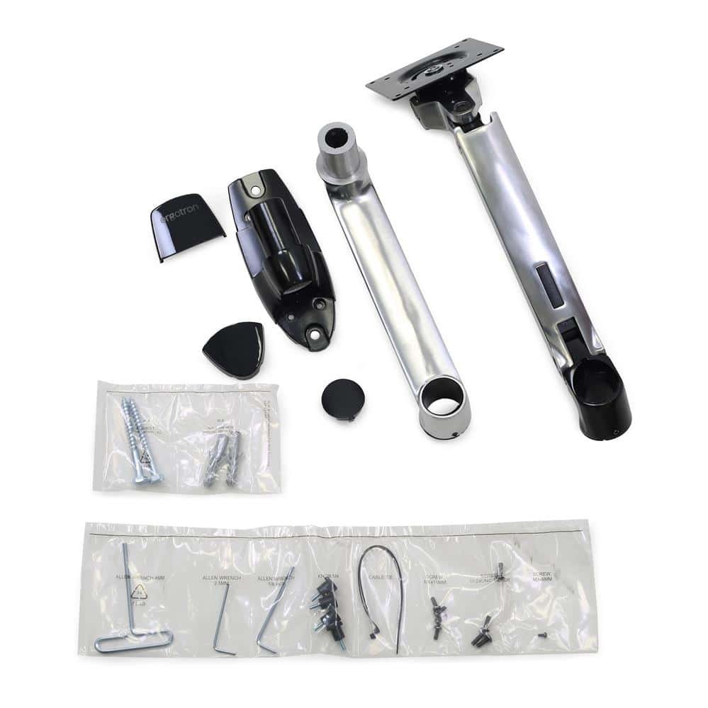 Includes arm, extension, wall mount base, fasteners for wood stud or concrete wall, attachment hardware