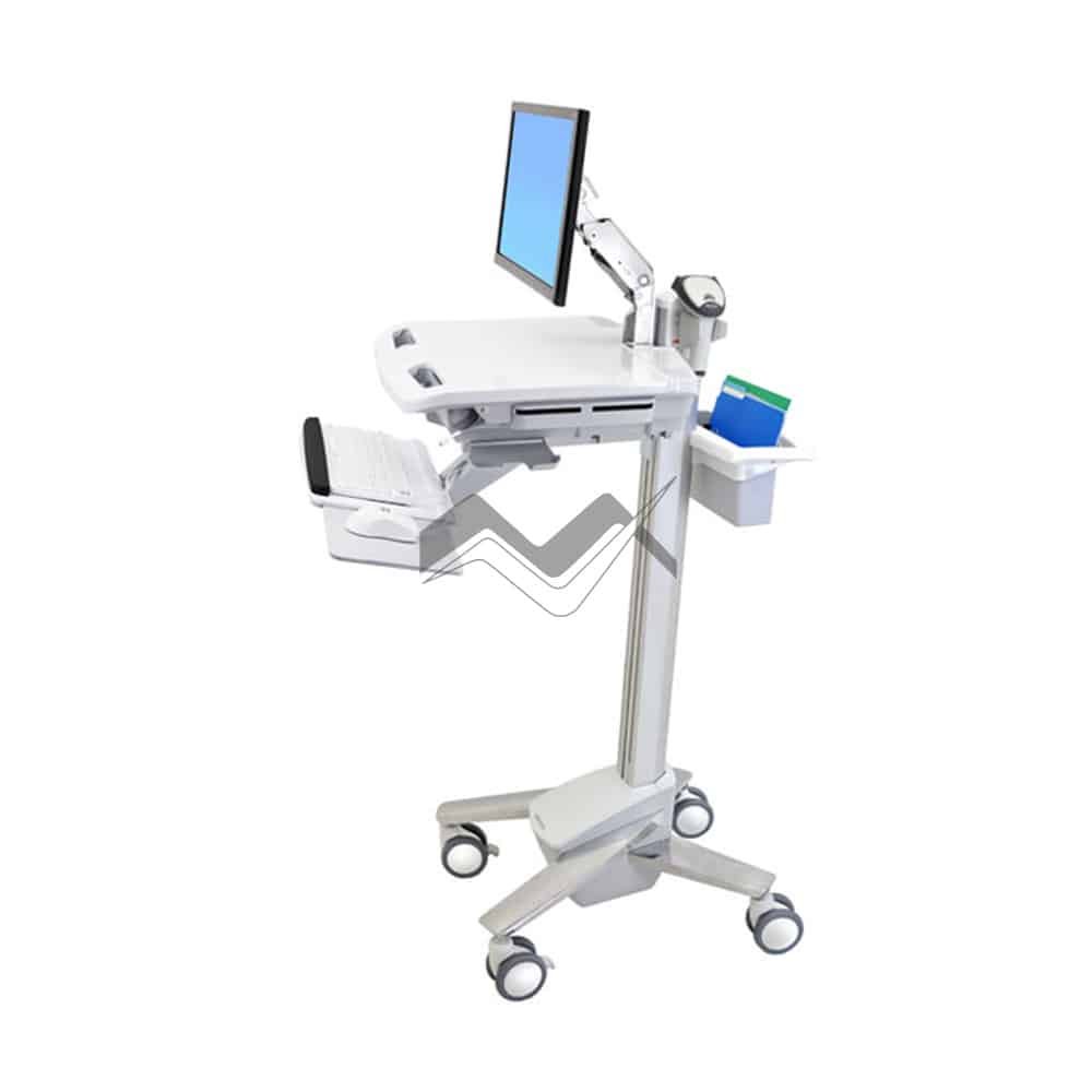 The ergonomic sit-stand StyleView® Cart with LCD Arm brings forward modern ergonomic model featuring sit-to-stand height adjustment, side-to-side LCD and keyboard motion, bi-focal viewing and an adjustable back-tilt keyboard. This lightweight cart for hospital reflects Ergotron's years of experience in point-of-care computing to help nurses and caregivers improve their productivity. * It is recommended that a discharge test be conducted when the healthcare cart is first purchased to determine runtime with computer equipment configured on the cart. Change batteries when instructed by StyleLink battery management software. If StyleLink is not used, it is strongly recommended a monthly discharge test be conducted to determine runtime loss. If runtime is less than 50% of original, batteries must be changed