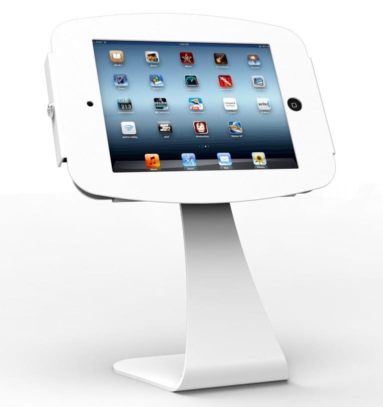 Elegantly designed, this iPad enclosure kiosk features sleek, white, swan-necked sloping stand allowing you to introduce a level of class to any setups.
