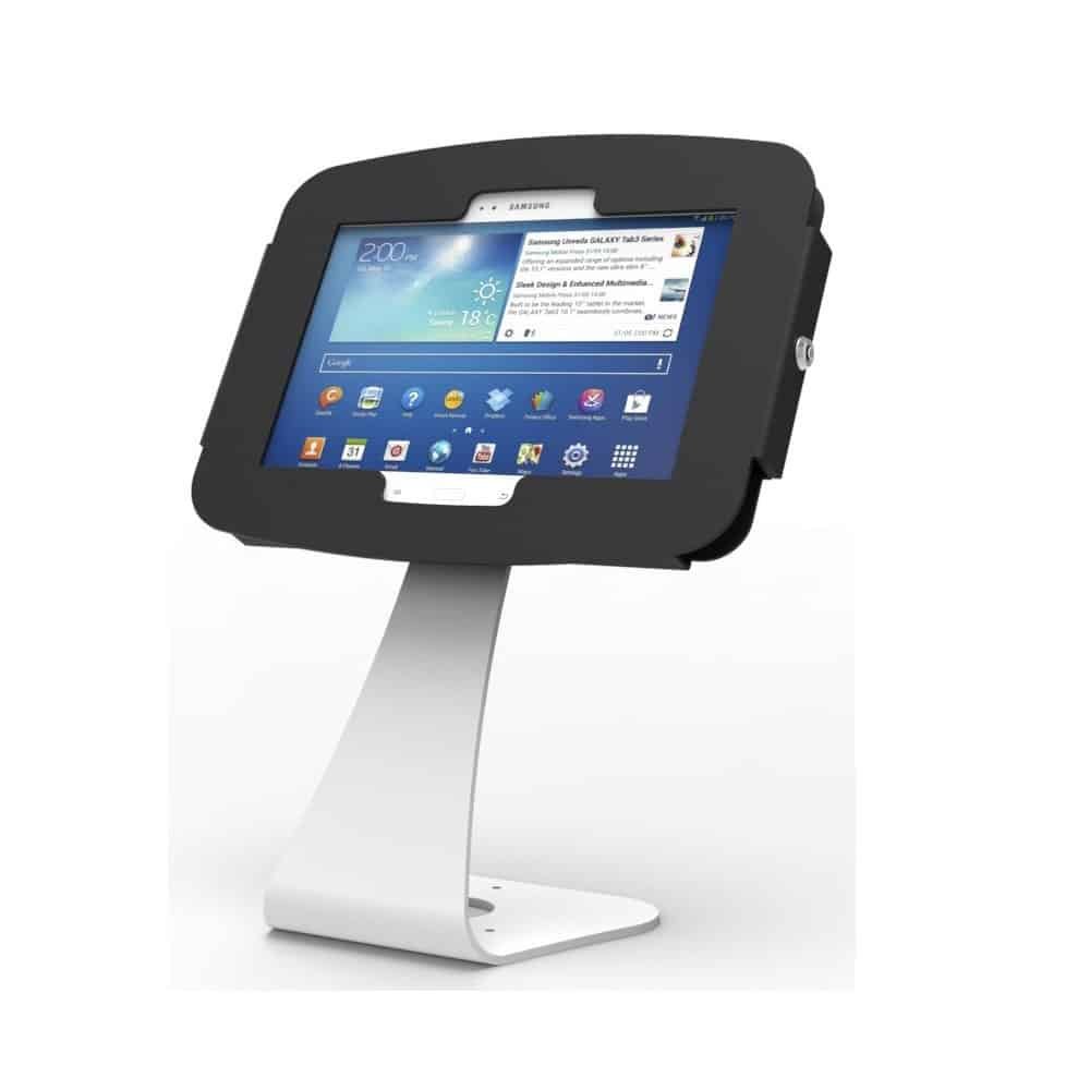 Elegantly designed, this Samsung Galaxy tablet enclosure kiosk features a sleek, white, swan-necked sloping stand which allows you to introduce a new level of class to any setup. With the ability to rotate in a 90-degree angle and angle at 60 degrees, this tablet stand provides optimal viewing while sitting securely at 35 cm above the counter-top.