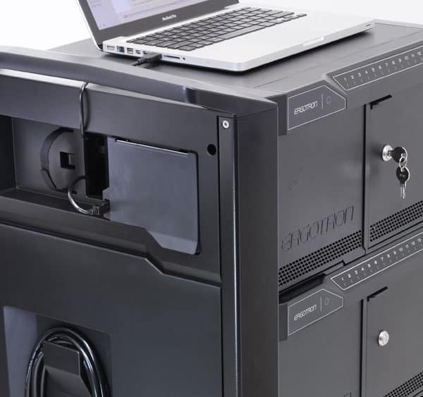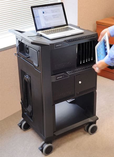 Tablet Management Cart from Ergotron is up to 47% smaller and lighter (unloaded) than competitive product in the market. The compact design enables this cart to easily move through limited space area. Furthermore, this cart’s small footprint also fits in a small corner when not in use.