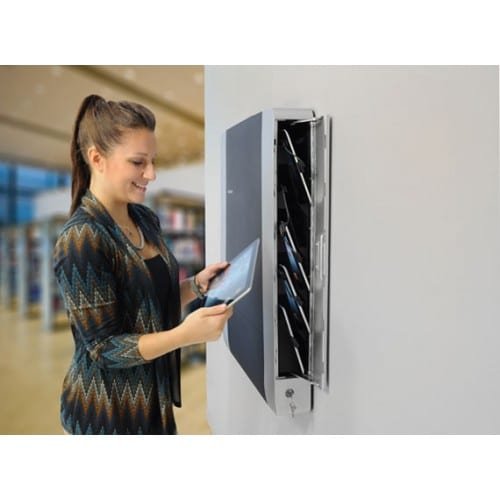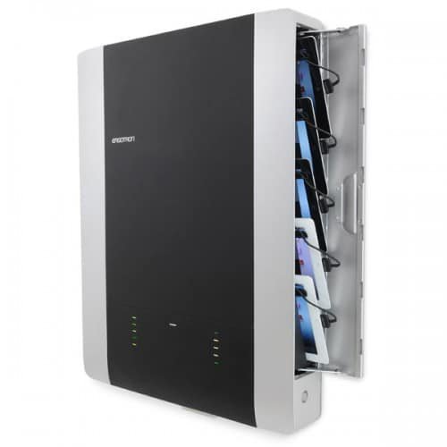 Sleek, low-profile enclosure accommodates the Apple iPad, iPad mini and iPod touch. Sync, charge and store up to 10 devices. Includes pre-installed 30-pin cables. Durable steel doors with robust six-point lock and key assembly provide strong theft deterrence. Features full 2.1A charging capability. Tested and certified to UL 60950-1 standards.